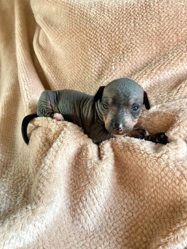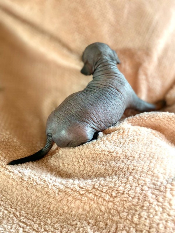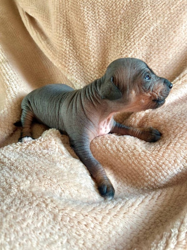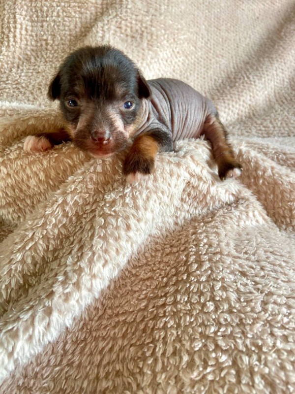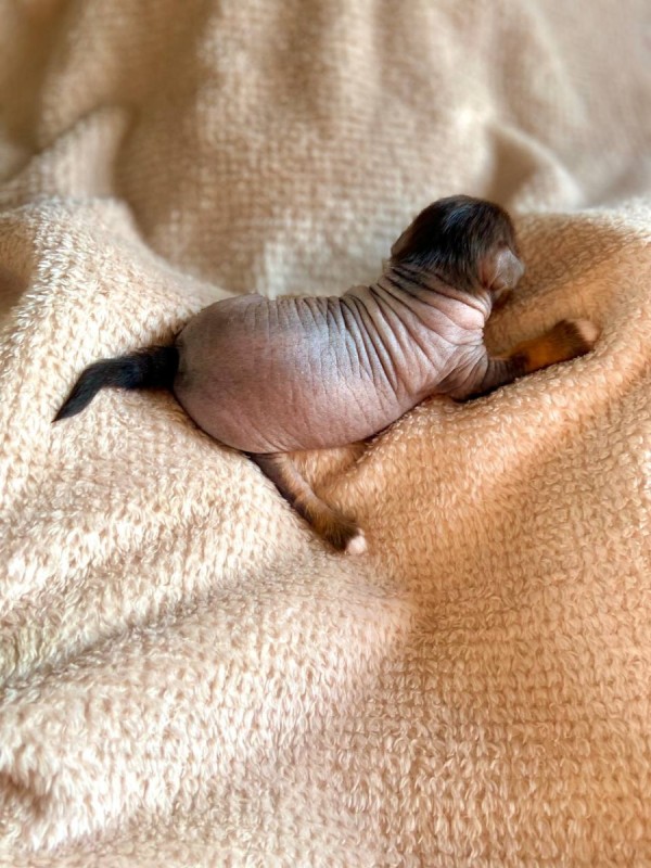 2. Мальчик, голый, окрас черно-подпалый (черная мочка носа, черная обводка глаз, основной цвет кожи черный, белый и рыжий цвет в зонах подпала, на лапках), без зароста