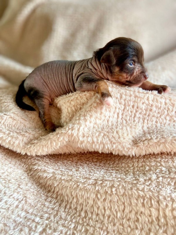 1. Девочка, голая, окрас шоколадный-триколор (коричневая мочка носа, коричневая обводка глаз, основной цвет шерсти коричневый), слабый зарост